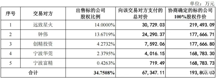 远致星火的收购价对应所在公司100%股权估值21.95亿元,溢价13.26%;钟伟、创精投资适用17.77亿元估值,折价8.32%;宁波华莞、宁波富精适用16.88亿元估值,折价12.91%。